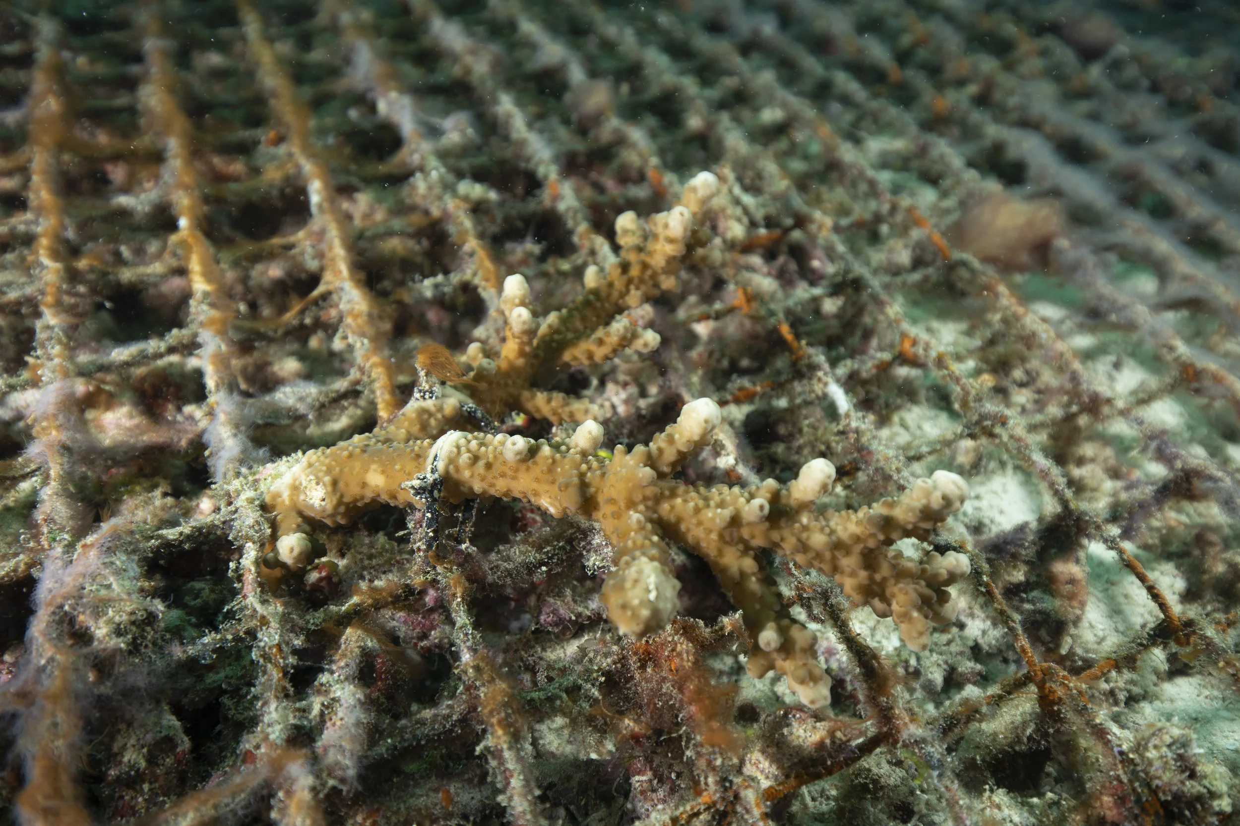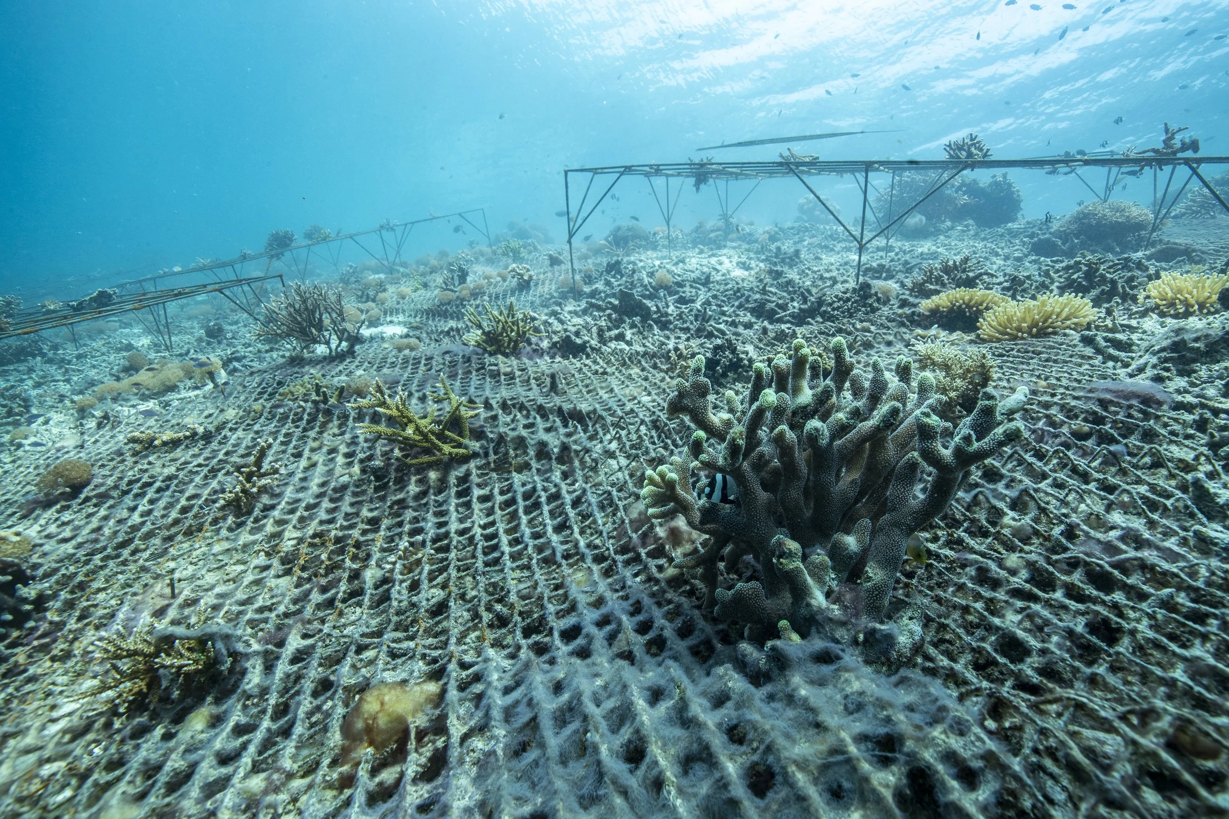 After this initial research phase, I had the opportunity to start my own restoration plot. With the help of my Indonesian collaborators, I designed a study which out-planted nearly 400 corals on wire mesh and steel table structures. I hope this study sheds light on making restoration more affordable, and increasing coral diversity in restoration efforts.